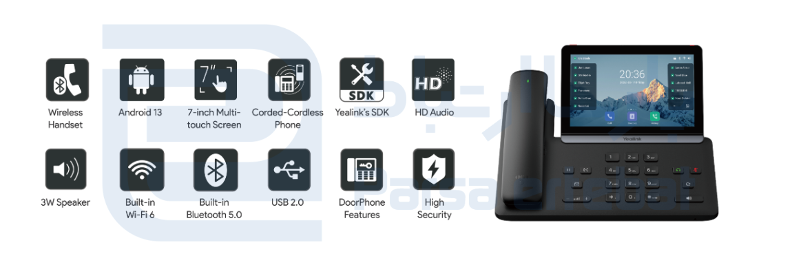 با صفحه لمسی ۷ اینچی، این گوشی تجربه کاربری شبیه به تبلت ارائه میدهد؛ رابط کاربری ساده و قابل تنظیم امکان دسترسی آسان به قابلیتها را فراهم میکند. همچنین، با پشتیبانی از Wi-Fi 6 و بلوتوث 5.0، انعطافپذیری بیشتری برای قرار دادن گوشی در مکانهای مختلف فراهم است .